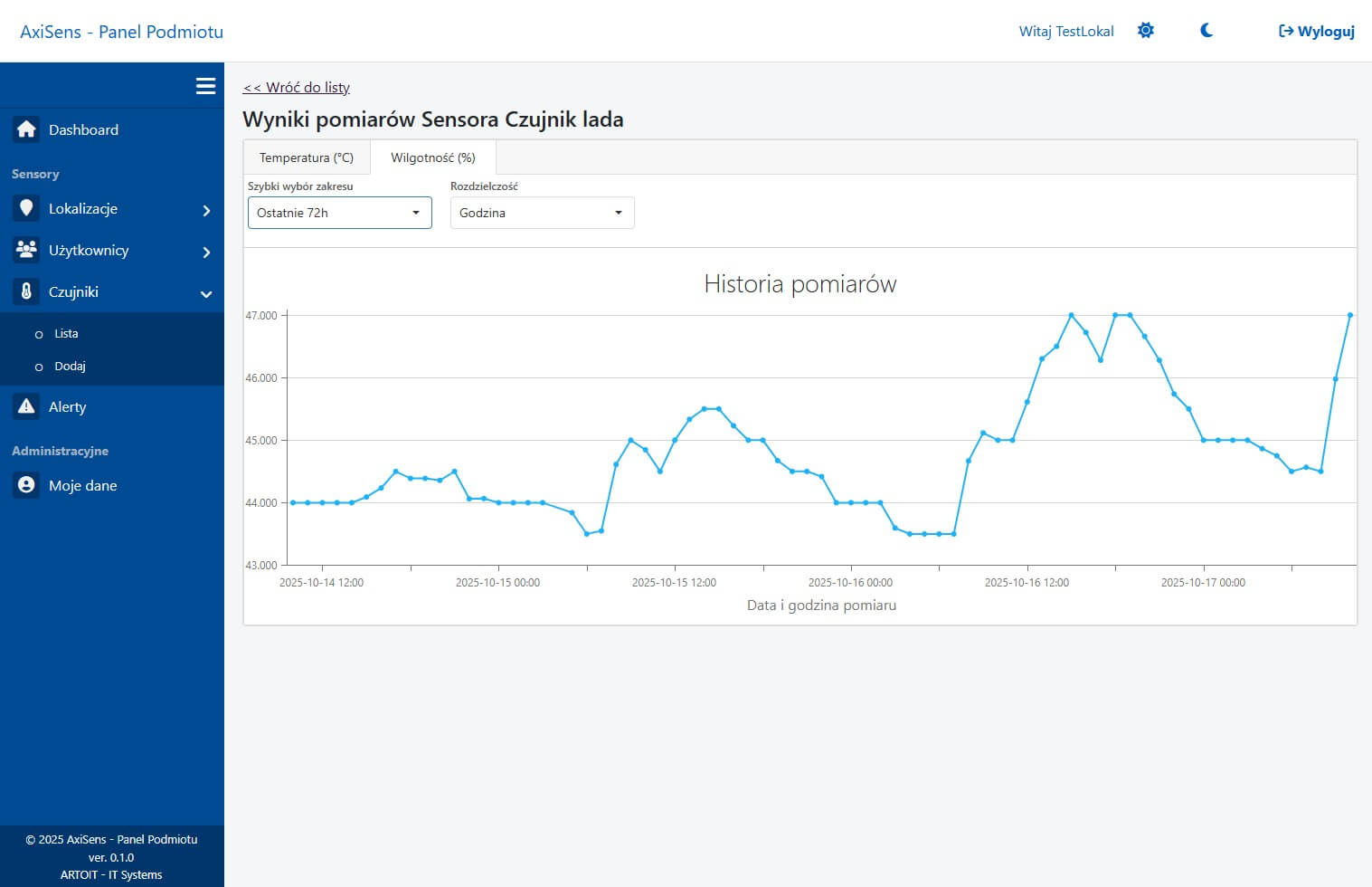 - Podgląd wartości pomiarów: Ekran czujnika* + na koncie AxiSensCloud